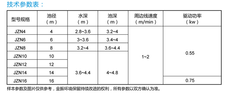 工作橋由安裝在周邊的驅動機構帶動,繞安裝在池中心支墩上的中心支座旋轉。懸掛在工作橋下桁架上的濃縮攪拌柵條穿行于污泥層中,能為水提供從污泥中逸出的通道,從而提高污泥濃縮的效果。同時桁架下部的斜置刮泥板將沉淀在池底的污泥收集至中央集泥坑。液面上的浮渣在浮渣刮板和周邊擋渣板形成的漸縮區域內集中,由浮渣刮耙扒到集渣斗,排出池外。