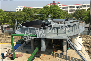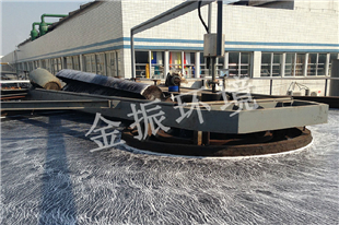 JQF型高效淺層氣浮裝置集凝聚、氣浮、撇渣、沉淀、刮泥為一體,整體呈圓柱形,結構緊湊,池子較淺。裝置主體由五大部分組成:池體、旋轉布水機構、溶氣釋放機構、框架機構、集水機構等。進水口、出水口與浮渣排出口全部集中在池體中央區域內,布水機構、集水機構、溶氣釋放機構都與框架緊密連接在一起,圍繞池體中心轉動。